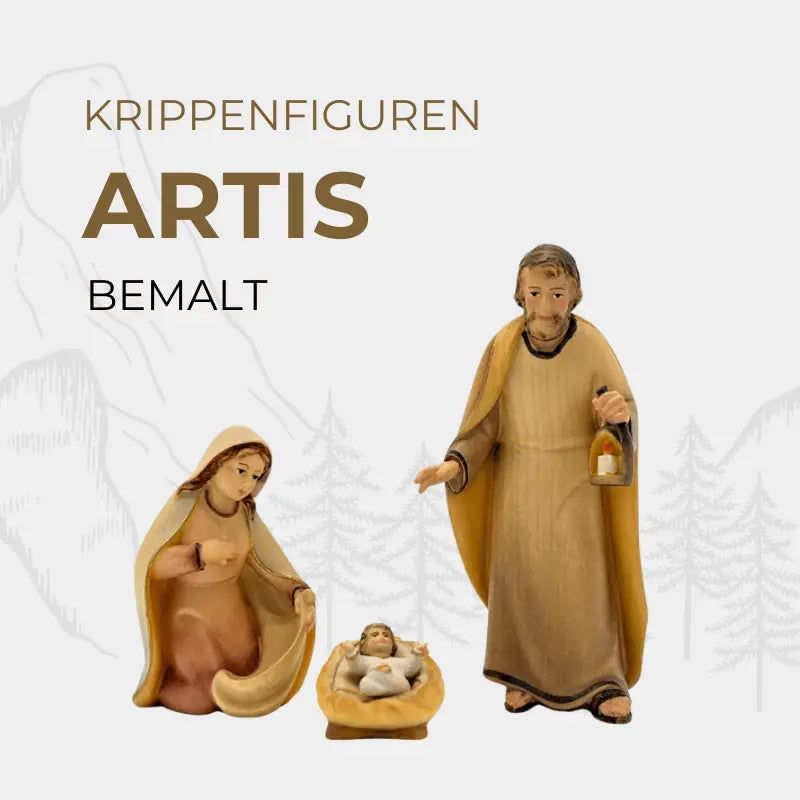 Das 7er Set der Kostner Krippe besteht aus den drei wichtigsten Krippenfiguren der traditionellen Weihnachtskrippe: der Hl. Maria, dem Hl. Josef und dem Jesuskind. Das Set beinhaltet außerdem den Ochsen, den Esel, den Schäfer und das Schaf stehend rechtsschauend. Diese Figuren wurde mit Sorgfalt und Liebe zum Detail entworfen und aus edlem und hochwertigen Bergahornholz geschnitzt. Die Bemalung des gesamten Sets erfolgt nach traditionellem Vorbild und gilt somit als ein handwerkliches Unikat mit höchster Qualität.